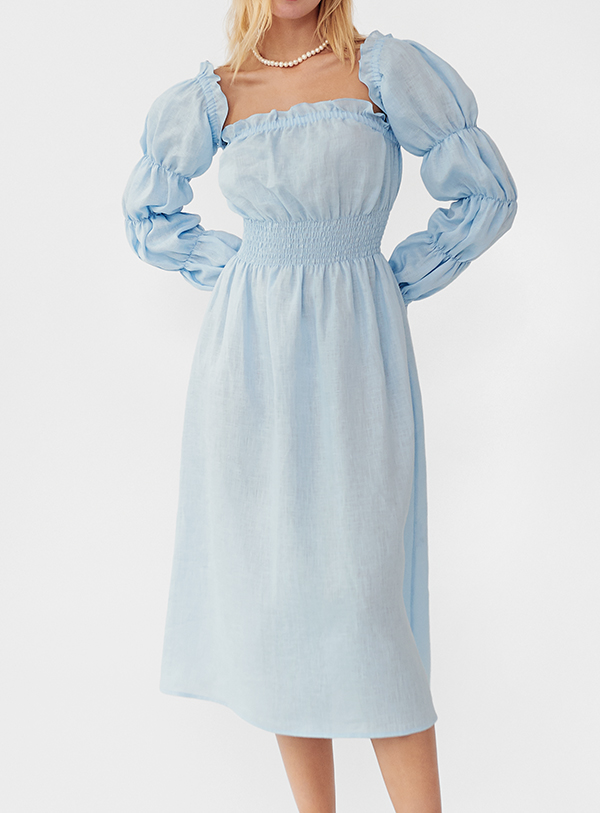 This 100% linen dress was designed to create the utmost feminine silhouette. Ample breast line and a waist that is supported by soft rubber strands form an hourglass feminine silhouette. Square neckline reveals a collarbone. The sleeves are trimmed at intervals with soft silicone rubber strands that keep the sleeve at the place. The linen dress is easy to care for, making it ideal for all of life’s moments.