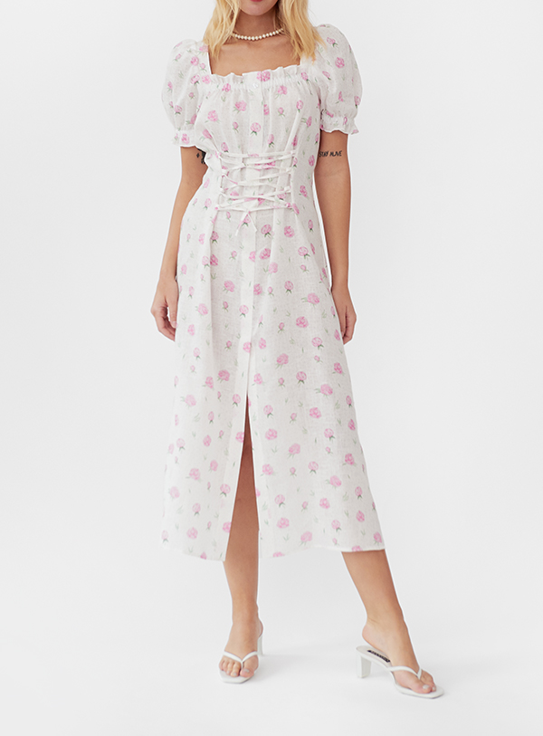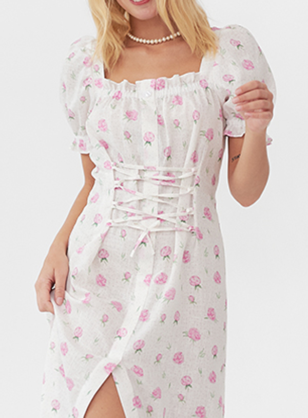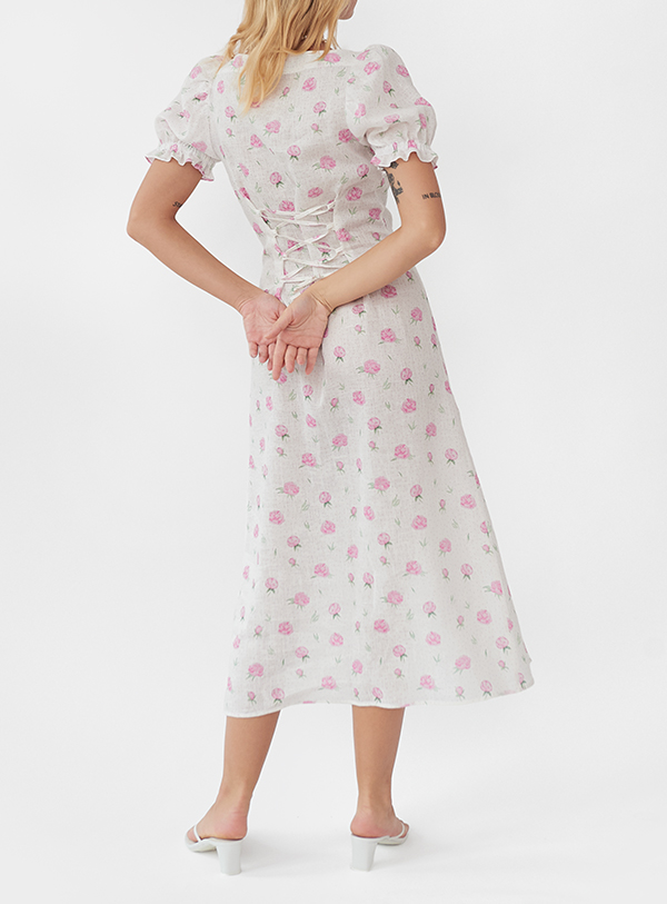 Self-care is embodied in this linen dress. The inspiration comes from the screening of “Angélique, Marquise des Angles” and French novels. Corset tightening embodies this linen short-sleeved dress. Because the tightening is both in front and in the back, this dress guarantees the ideal look — front slit. The top of the dress fastens with a button.
