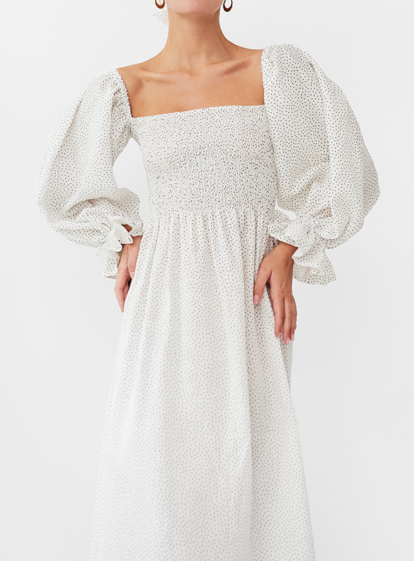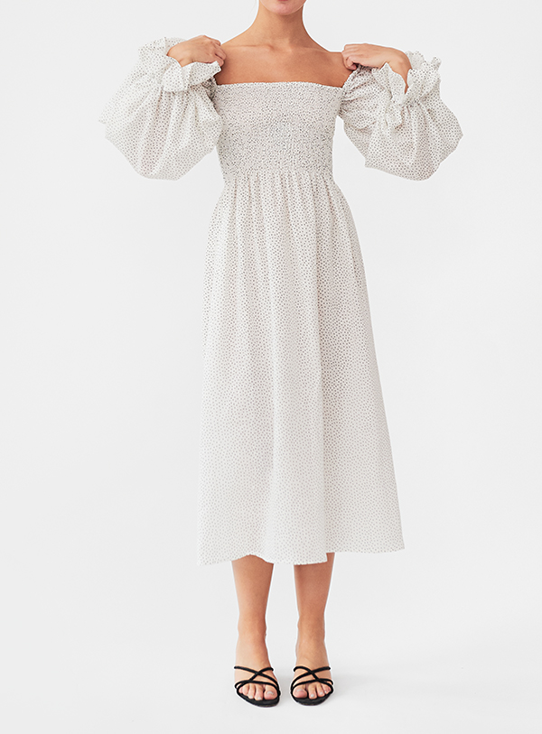 This dress was created and meant to be worn in the company of friends and loved ones. The sleeves can be dropped down for exposed shoulders. The dress has a simple cut. This dress has a smocked bodice which allows you to wear it without a bra comfortably, regardless of breast size.